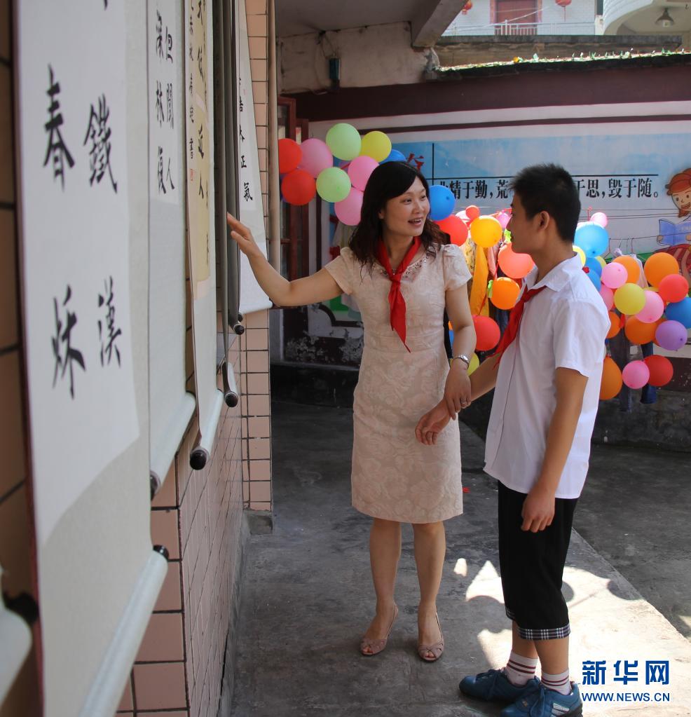 田艳(左)在贵州省印江县特殊教育学校观看孩子们的书画作品(2016年6月1日摄)。新华社发