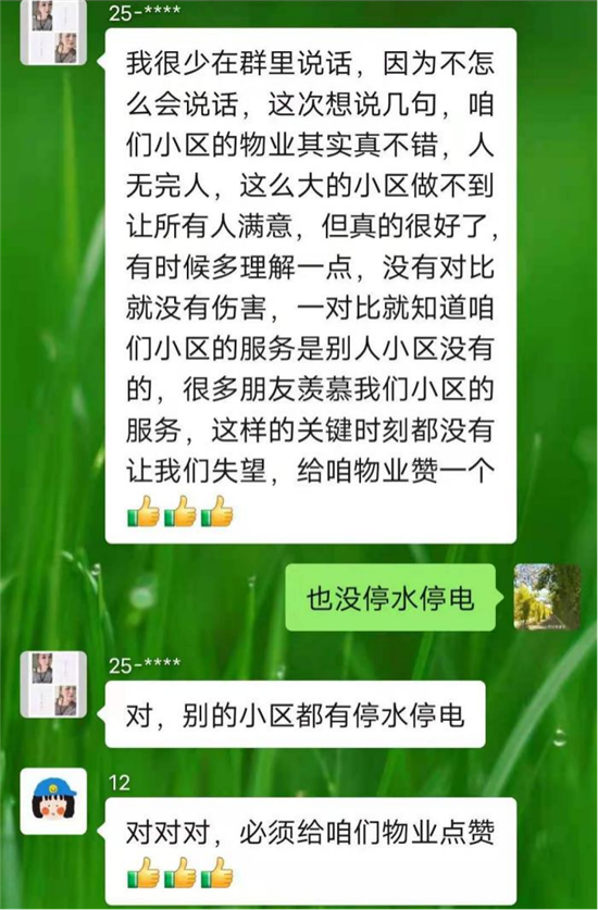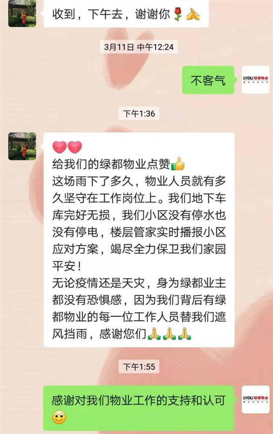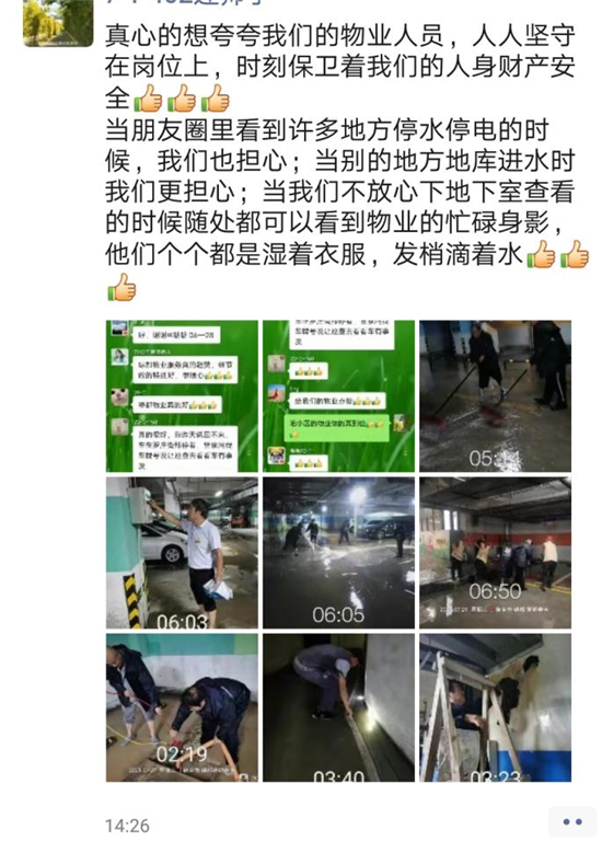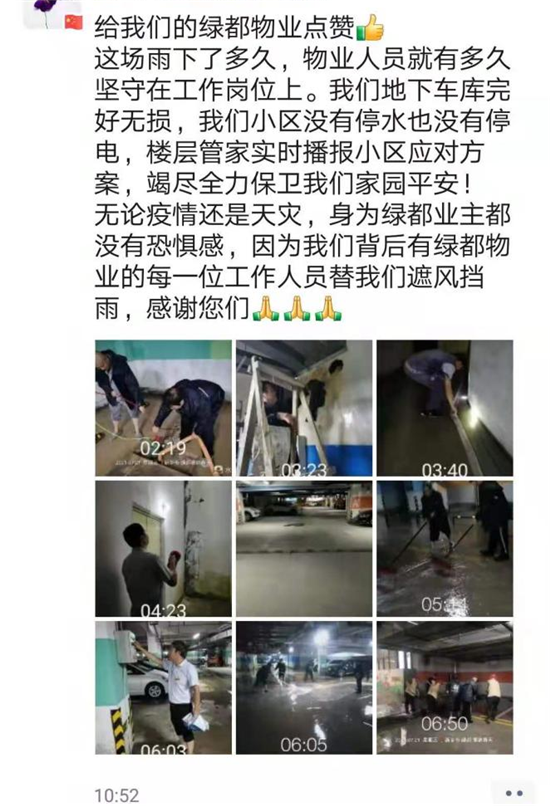 尽管滂沱大雨下个不停,但园区随处可见绿都人忙碌的身影,他们的全身早已被雨水淋湿,发梢滴着水,依旧一往无前,一遍遍巡视,一遍遍清扫,全力保护着业主的人身和财产安全。在如火如荼的紧张防汛中,物业人的全身心付出也得到了业主们的充分肯定,纷纷在业主群中表达对物业的称赞。