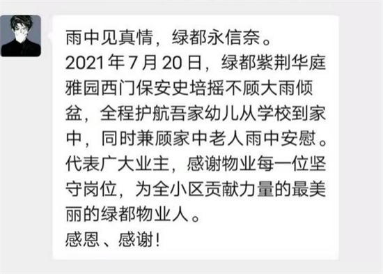 业主们守护家园的决心,让绿都物业人也深受感动,纷纷感慨:“感谢每一位携手并肩的绿都家人,72个小时坚守园区,我们众力团结一股绳,众志成城与天争。河南一定行”。