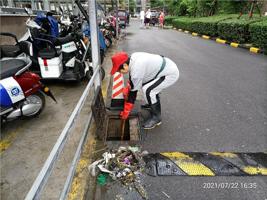 眼看暴雨越来越大,排水是园区抗汛的重中之重。一遍、两遍、三遍、五遍……冒着大雨,绿都物业工作人员一遍又一遍地用手探入早已看不到地面的水中,把堵塞下水道的垃圾、树叶一个又一个地清理出来,确保排水畅通,避免园区内积水给业主生命财产带来损失。