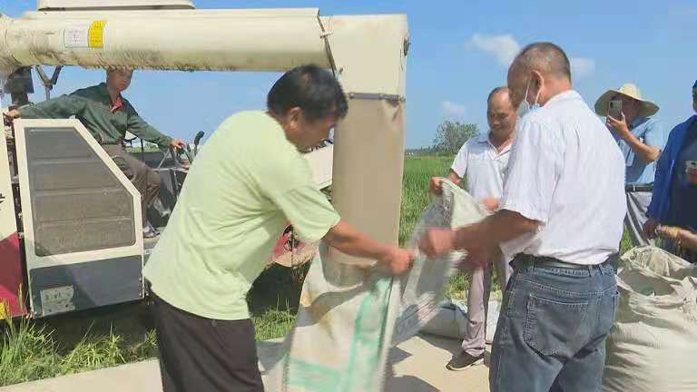 8月18日,迎来了开镰收割时节。河南省信阳市息县曹黄林镇丁寨村再生稻实验田种植基地里,一片金灿灿的稻田边,沉甸甸的稻穗随风摇摆,现场一台联合收割机正有序进行着作物收割,两名装袋工人麻利的绑着绳结,装袋、称重、装车,整个一派喜人的丰收景象。
