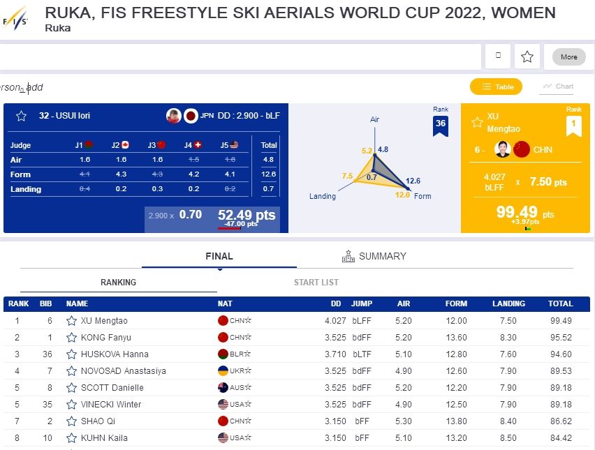 鲁卡站是本赛季自由式滑雪空中技巧世界杯分站赛首站,也是中国队在本赛季的首次亮相。2日进行的首场女子组比赛中,平昌冬奥会铜牌得主孔凡钰资格赛表现不佳仅排名第八,但随后在决赛轮表现出色,最终凭借决赛第二轮难度系数3.525的动作得到全场最高的89.53分,摘得冠军。