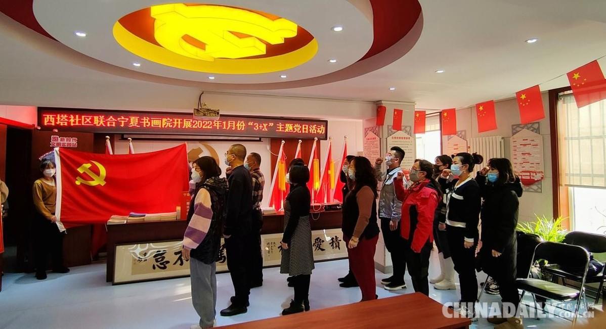 壬寅虎年来临之际,宁夏书画院党支部全体党员及部分创作员走进西塔社区开展重温入党誓词、捐赠书画作品、现场书写春联、送祝福等系列活动。在西塔社区党群活动室,老党员、退伍军人、环卫工人、社区群众与书画院艺术家们济济一堂,写春联迎新春话党恩。一名 90 多岁的老党员因身体原因不能到场,特意通过社区工作人员表达了他想要一副春联的愿望,春联内容也已自行拟好,周一新院长听闻,欣然命笔写下一副对联送给这位老党员,并祝他健康长寿。