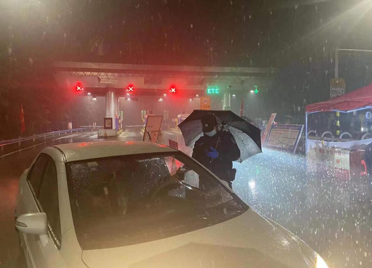 图为暴雨下卡点一线值班人员坚守岗位,查看返乡人员行程码