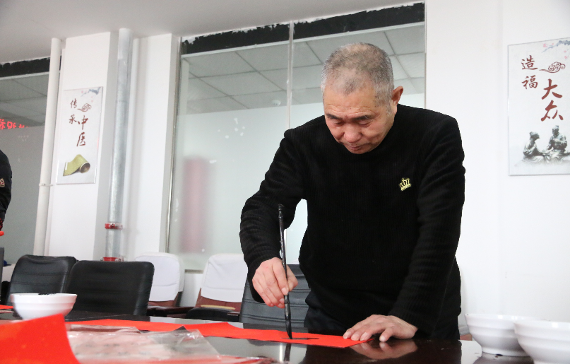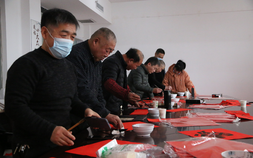 通许县知名书法家李传玉,李彬,娄永辉,万安庄,韩胜显,陈占东,王劲松挥毫泼墨,开笔写“福”字、写对联,只见书法家们笔走龙蛇,