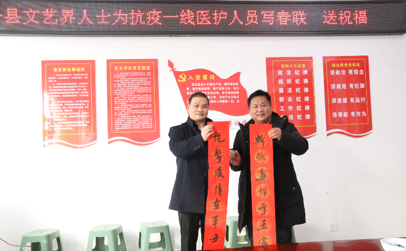 为讴歌时代,赞美英雄,营造温馨祥和的节日气氛,元月25日,开封市通许县文艺界人士组织书法家、楹联专家等,为抗疫一线医护人员举行“写春联 送祝福”活动。通许县文联主席陈玉永,通许县第一医院院长王兵站、宣传科科长刘志杰,通许县辞赋楹联学会会长张艳丽,副会长金学峰、任根明参加活动。