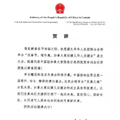 中国驻加拿大大使馆临时代办兰和平代表丛培武大使向后援会的成立发来贺辞。贺辞说,举世瞩目的北京冬奥会即将开幕,中国将向世界呈现一届简约、安全、精彩的奥运盛会,北京必将作为“双奥之城”永载史册。加拿大奥运健儿后援会的成立具有积极意义。