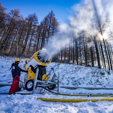 冷却的水和压缩空气在造雪机中混合后倾斜喷射到水滴中。在低温作用下,这些水滴就会凝结成冰晶。