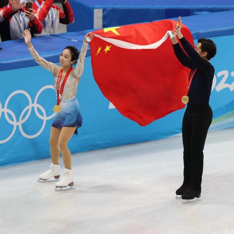 中国日报北京2月19日电(记者 张威 冯永斌)2022年2月19日,北京2022年冬奥会花样滑冰双人滑自由滑比赛在北京首都体育馆举行,中国队选手隋文静/韩聪夺得双人滑冠军。