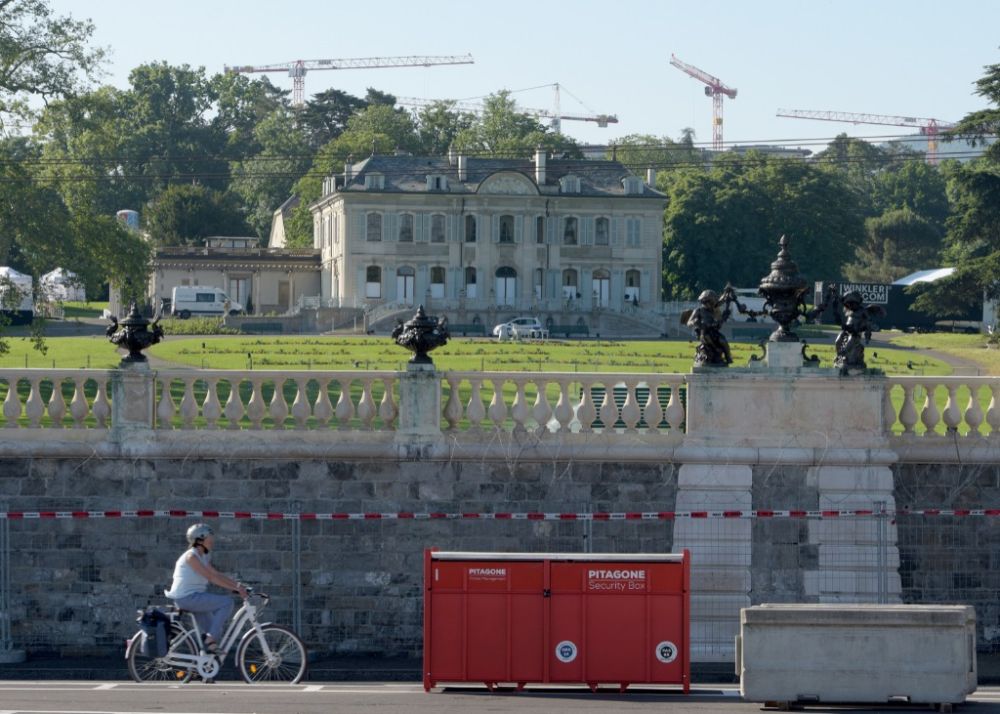 2021年6月15日,一名女子骑车从瑞士日内瓦拉格朗热别墅外围经过。(新华社记者郭晨摄)