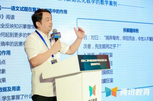 北京师范大学第二附属中学特级教师、北京师范大学研究员何杰在会上分享了北师大二附中团队在语文学科中,基于认知数据的精准教学研究。他以一篇文言文训练题为例,对普通班和文科实验班在拆解训练中生成的知识内容数据、能力水平数据和完成用时数据进行对比,并分析了这些数据背后反映的具体学情,展现了在语文学科的教学情境中,大数据帮助教师精准定位知识弱点、精准定位训练对象和精准反馈教学效果的实际效用。