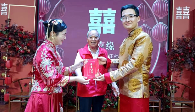 签承诺、读诺言、跨马鞍、迈火盆、拜天地、结发礼、赠寄语、传家训……一样都不少,简约不失浪漫,大气而不奢华。日前,山东单县张集镇的新时代文明实践大礼堂承办了一场文明新婚礼,张集镇刘庄社区党支部书记王淑响向一对新人颁发了《新式婚礼荣誉证书》,并代表全村居民表示祝贺。亲朋好友耳目一新,向新人献上真心祝福。