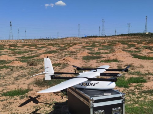 据了解,本次输电通道巡视使用的垂直起降固定翼无人机,机身宽度近2.5米,机身内部搭载两部高清摄像头,配备大容量电池作为动力源。该无人机通过四支旋翼完成垂直起降和悬停,无人机前端配置一支旋翼与机身固定翼配合实现平稳快速飞行,结合高清摄像头在飞行过程中对输电线路通道进行巡视航拍,具有续航时间长、飞行距离远、飞行速度快、载具多样化、任务执行效率高、实时图传等优点。单架次飞行1小时可巡视约30公里线路,完成航线规划和设定后,全自动起降、巡航,无需人工干预。