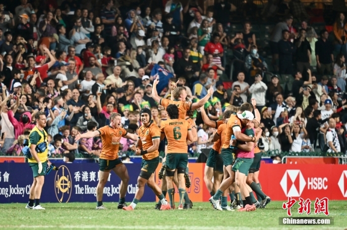 11月6日,香港国际七人榄球赛进行最后一天赛事,最终澳大利亚力压斐济夺得冠军。图为澳大利亚于决赛中获胜一刻,球员互相庆祝。 中新社记者 李志华 摄
