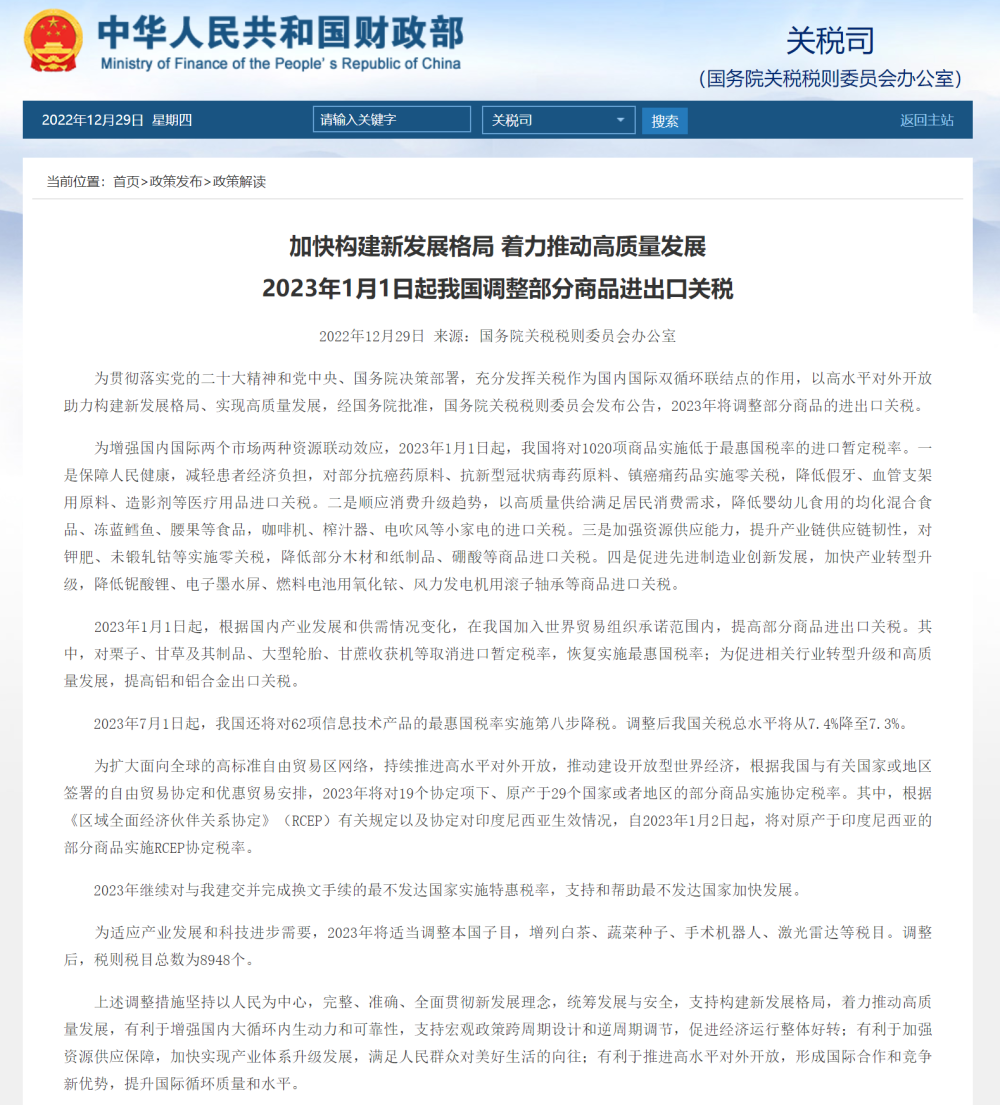 为贯彻落实党的二十大精神和党中央、国务院决策部署,充分发挥关税作为国内国际双循环联结点的作用,以高水平对外开放助力构建新发展格局、实现高质量发展,经国务院批准,国务院关税税则委员会发布公告,2023年将调整部分商品的进出口关税。