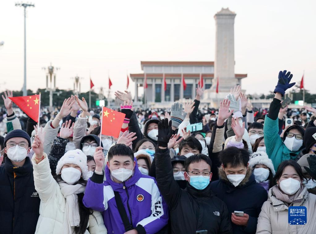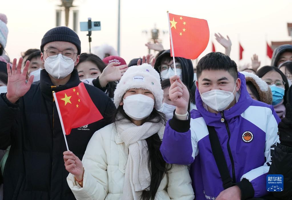 1月1日晨,北京天安门广场举行隆重的升国旗仪式。这是观众在升旗仪式结束后挥手致意。新华社记者 张晨霖 摄
