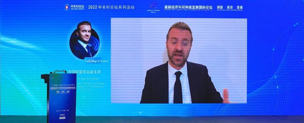 中国欧盟商会副主席 Carlo Diego D'Andrea 发表了题为《欧盟美丽健康企业在中国的创新和发展》的演讲。他指出,欧盟商会的成员在国内经营业务的低碳发展方面走在前列,几乎一半的成员已经建立了低碳团队。他坚信欧盟和中国有着坚实的合作基础和巨大的潜力,可以共同推进美丽经济和相关绿色行业。
