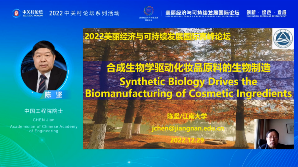中国工程院院士陈坚发表了题为《合成生物学驱动化妆品原料的生物制造》的主旨演讲。他指出,生物制造是化妆品原料发展的必然趋势,并在会上分享了研究团队在合成生物学技术方面的创新成果,通过将合成生物学技术和提取工艺结合起来,获得了超高分子量的透明质酸,并通过对HA合酶的筛选和代谢的调控等手段,建立了中高分子量透明质酸细胞工厂。