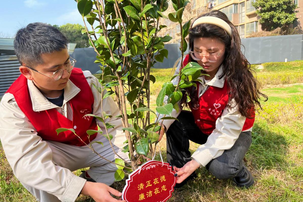 签约仪式后,三位书记带领全体党团青年来到项目一期的小区空地,挖土、植树、浇水,在互相配合中种下一棵棵代表着廉洁的树苗,恰同“廉”种于心,“正”植于身,让春色绿意托起清风正气。