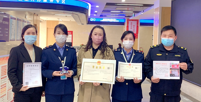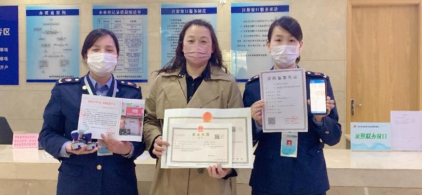 3月30日,河南新乡市牧野区市场监督管理局联同区卫健委、城管局通过“证照联办”窗口,一次性为新乡市牧野区的王燕芳中医诊所有限公司发放三份证照:营业执照、诊所备案凭证、户外广告匾牌设置许可证,同时为其发放了公章、电子营业执照、电子印章。