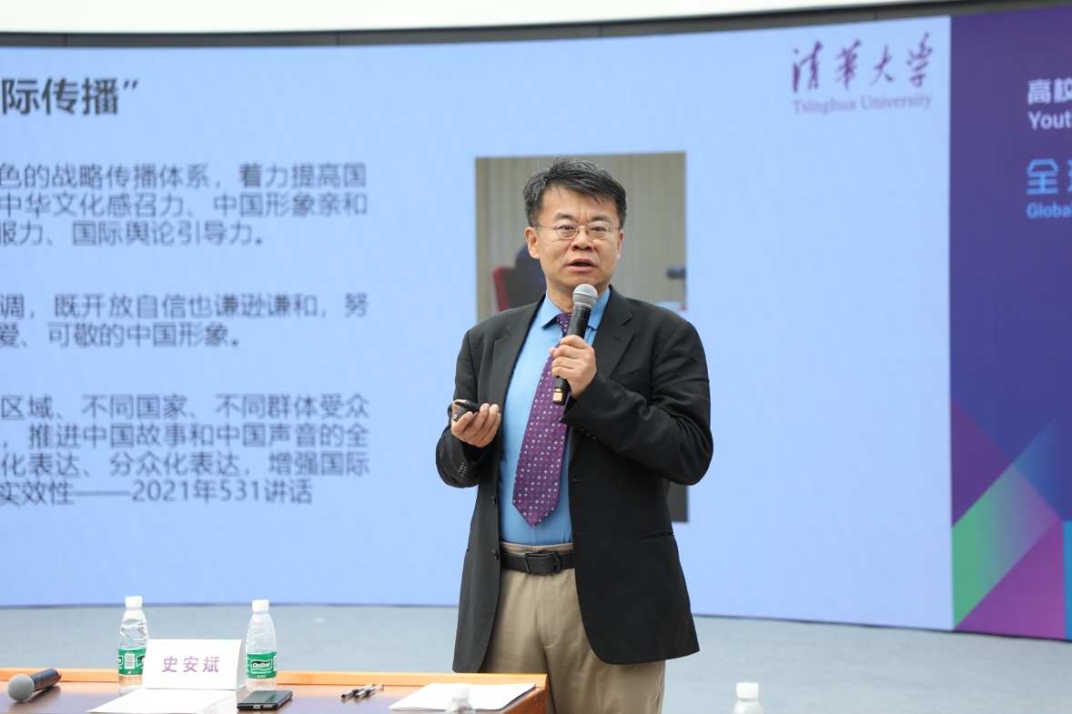 天津大学党委常委、宣传部部长杨欢,西安交通大学党委常委、宣传部部长成进,对外经济贸易大学党委常委、宣传部部长张小锋,北京大学融媒体中心副主任罗玲,清华大学全球传播办公室主任陈垦在工作交流环节分别介绍了各高校“Z世代”青年国际传播工作的创新举措、具体案例和思考展望。