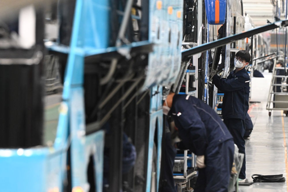 3月8日,在位于河南省郑州市的宇通新能源厂区高端及海外承装车间里,工作人员在流水线上忙碌地赶订单生产。新华社记者 李嘉南 摄