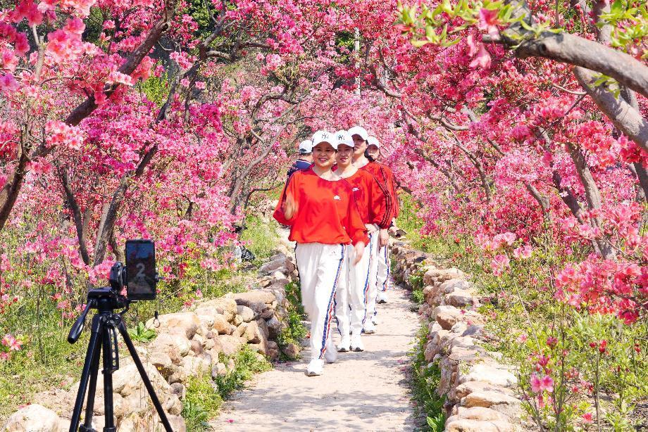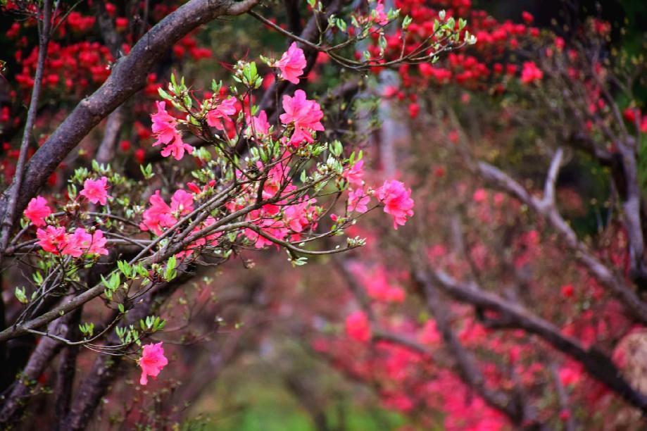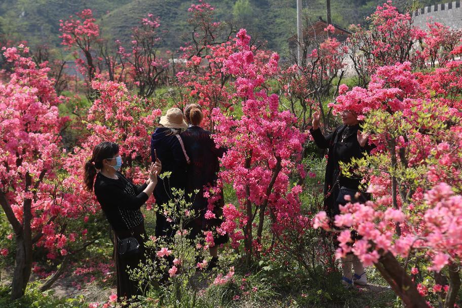 近日,在位于河南省信阳市新县卡房乡王畈村的杜鹃园里,一簇簇杜鹃花竞相绽放,美不胜收,吸引了十里八乡的群众和各地游客前来观赏、游玩。(图片/蒋仑、曾亚芳)