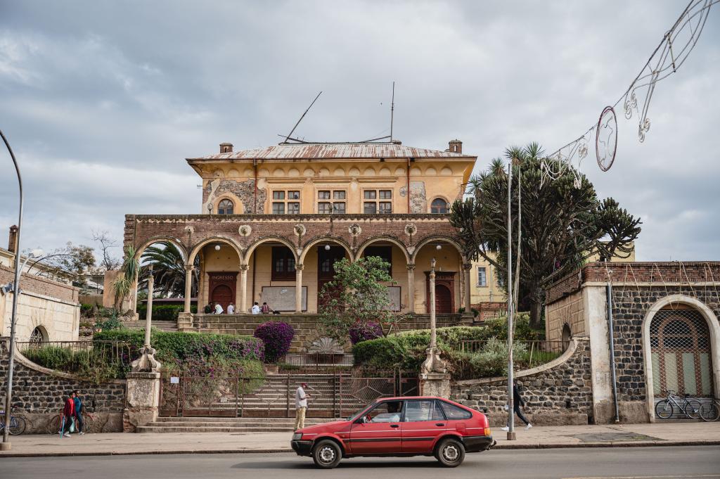 一辆汽车从厄立特里亚首都阿斯马拉的阿斯马拉歌剧院前驶过。