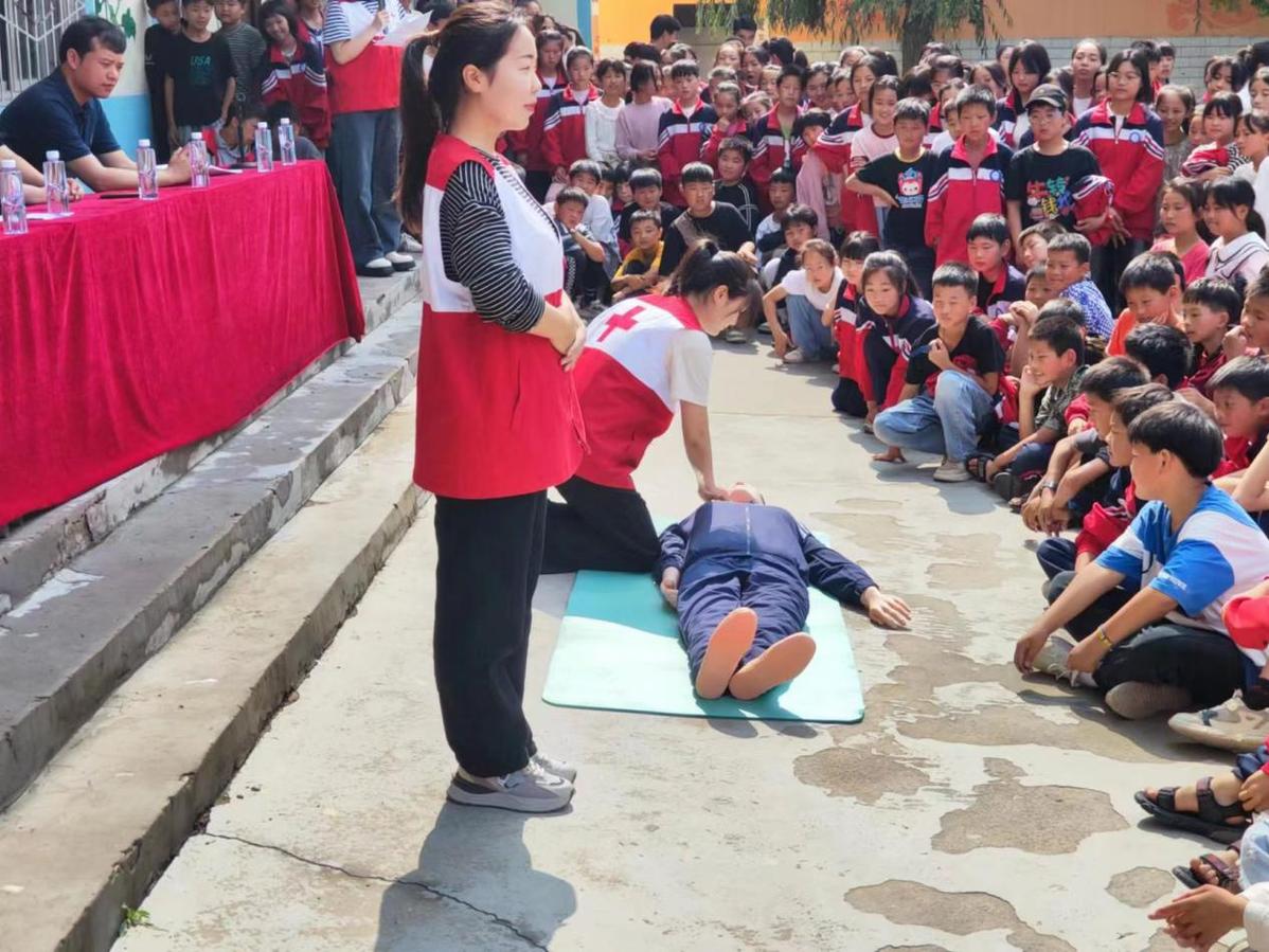 捐赠仪式结束后,县红十字会工作人员给同学们讲解了心肺复苏和防溺水应急安全知识。通过现场互动、提问等方式,邀请教师和学生参与,加深师生对防溺水安全知识的理解,帮助学生掌握急救器材的使用方法。工作人员们生动讲解、认真纠错,燃起了同学们的学习热情。