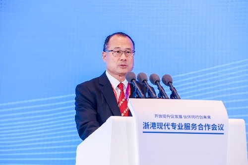全国政协常委、香港中华总商会会长、粤港澳大湾区企业家联盟主席、香港新华集团主席蔡冠深在“浙港现代专业服务合作会议”上发表演讲。