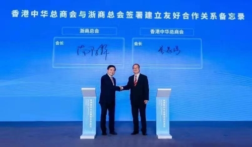 当日会上,香港中华总商会和浙商总会签署建立友好合作关系备忘录,约定发挥双方商会优势,带领两地专业人士、工商界人士进一步挖掘合作潜力,在更大范围、更宽领域、更深层次进行需求对接和优势互补,共同开拓国际市场,实现互利共赢。