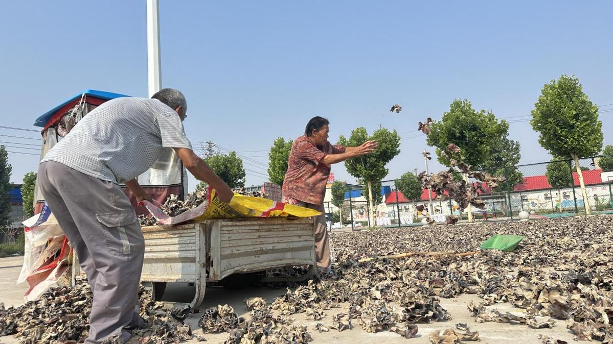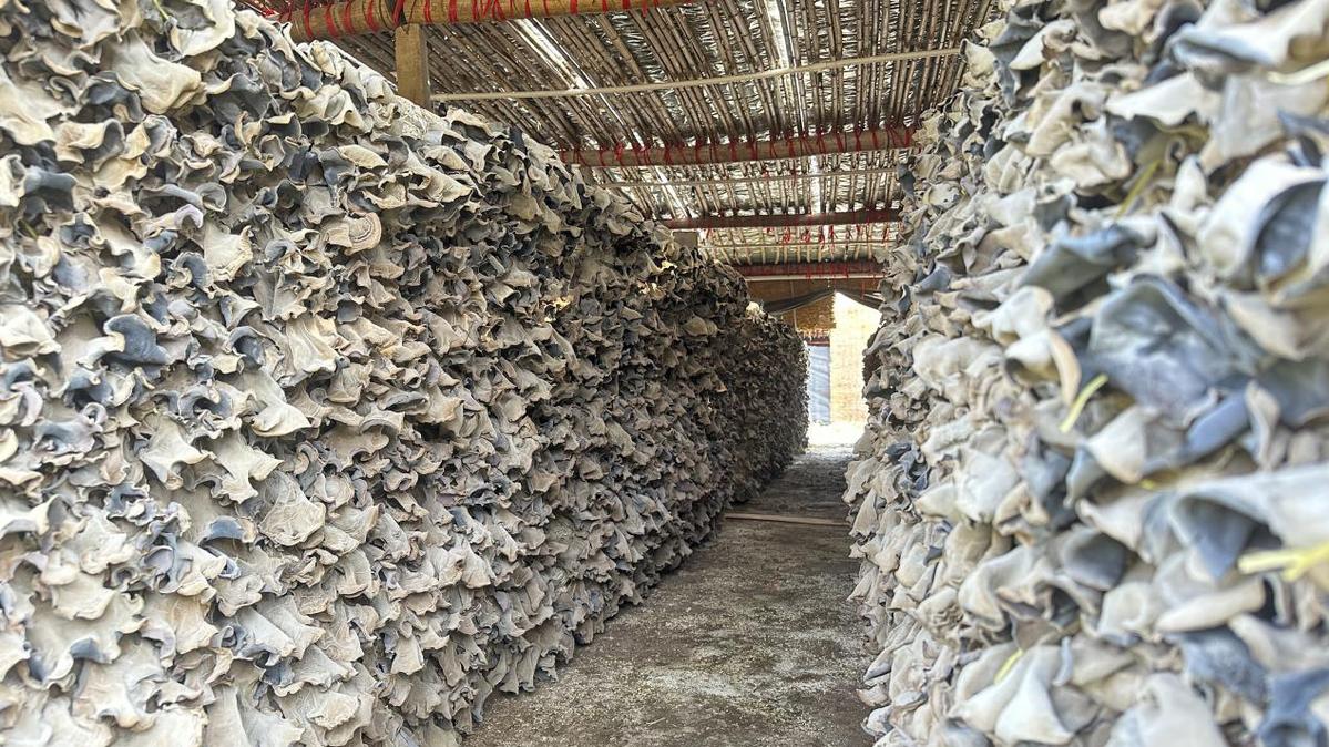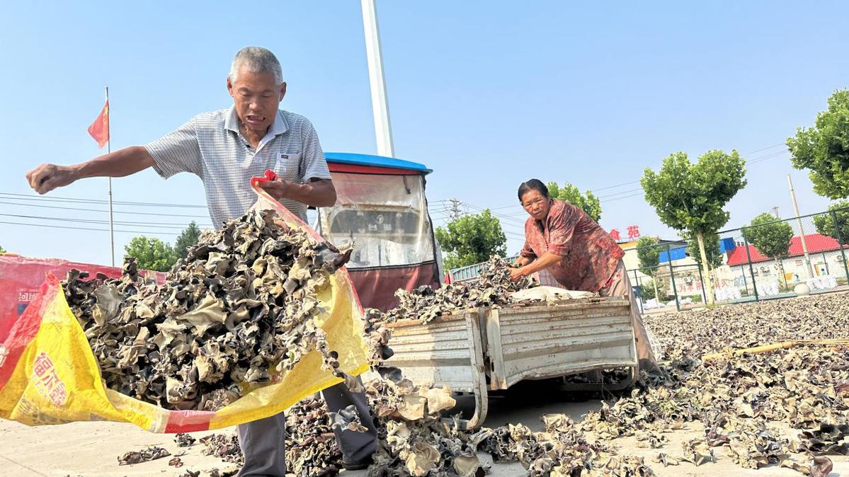 走进开封市尉氏县朱曲镇黄庄村木耳大棚内,一朵朵肥硕的毛木耳破袋而出,密密麻麻地长满了每个菌棒,在阳光地照耀下看起来色如墨玉、十分透亮。村民们穿梭在菌棒行列之间,忙着采摘、搬运、晾晒成熟的黑木耳,一言一行中透露出对丰收的喜悦和对未来美好生活的期盼。