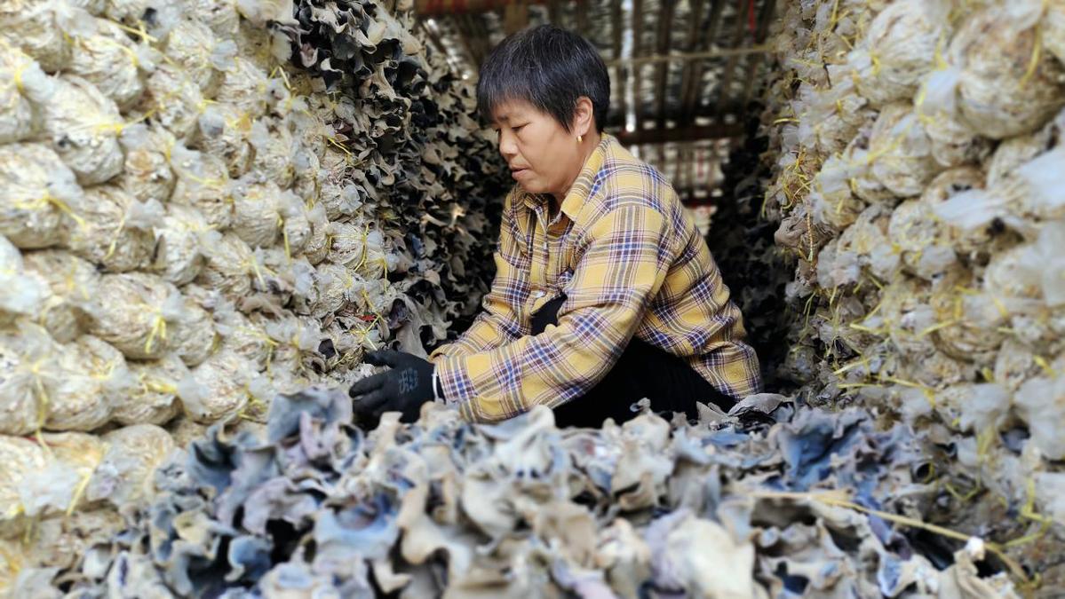 在现场,可以看到十几个村民在木耳棚内忙碌着,只见村民在地上放好袋子,快速将菌棒上的木耳采摘到塑料袋上,并将放满木耳的袋子挪到车子上,整个过程一气呵成。
