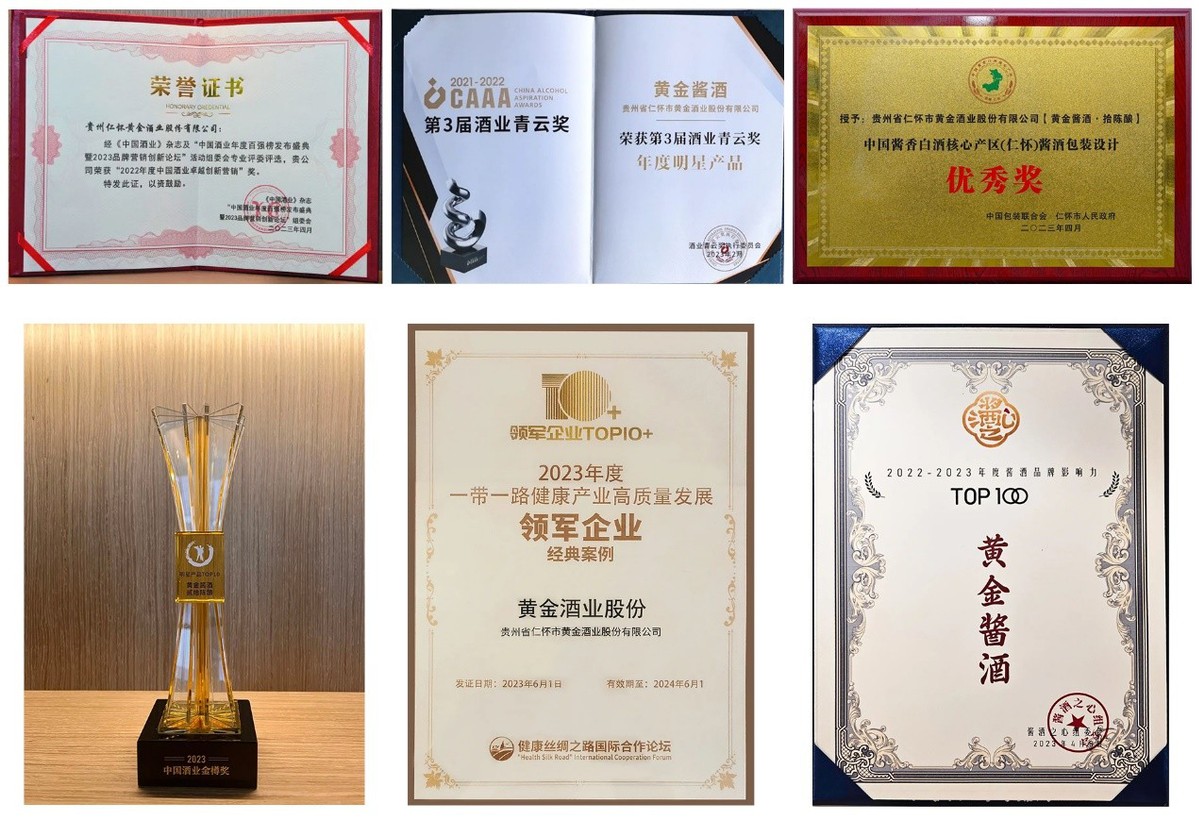 今年以来,黄金酱酒已先后荣获2022年度中国酒业卓越创新营销奖、第三届酒业青云奖“年度明星产品”奖、第七届红高梁奖“品牌建设奖”,荣登中国酱酒品牌影响力TOP100榜单、入选“2023年度一带一路健康产业高质量发展领军企业经典案例”,并且先后成为2023第八届中国国际物业管理高峰论坛唯一指定白酒以及“第二十一届大连国际徒步大会”唯一指定白酒。此外,黄金酱酒两大单品也分别获奖,黄金酱酒·拾陈酿荣获2023年中国酱香白酒核心产区(仁怀)酱酒包装设计优秀奖、黄金酱酒·贰拾陈酿荣获2023金樽奖“中国酒业明星产品TOP10”奖项。