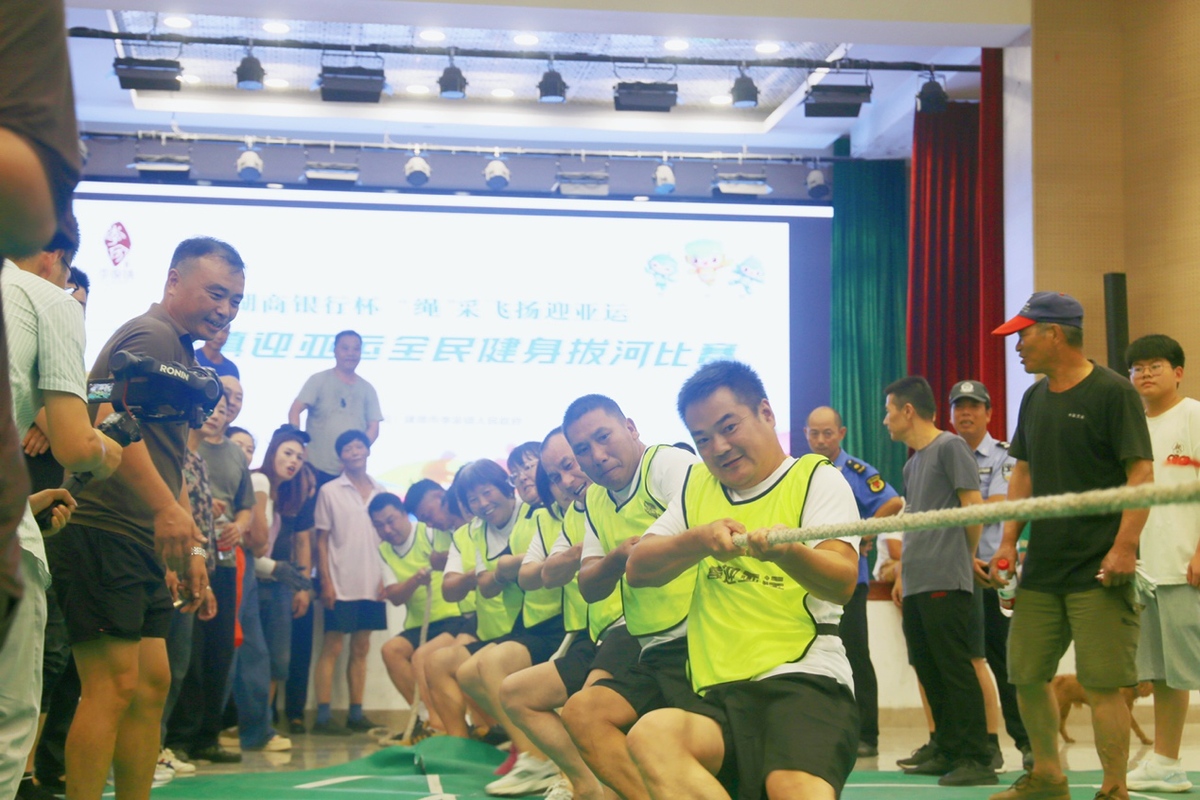 加油!加油!加油……8月7日,在我国第15个“全民健身日”来临之际,一场紧张刺激的拔河比赛在建德市李家镇李家村文化礼堂举行,来自镇机关、各行政村的12支代表队同台竞技,用一场别开生面的拔河比赛喜迎亚运,展现李家镇全民健身的丰硕成果。