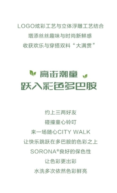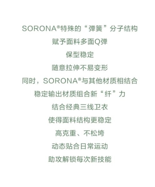SORONA是一项突破性的新型生物基聚合物解决方案,其核心原料来自每年可重复生长的植物。SORONA不仅具有符合潮流趋势的可持续发展和环保主题,而且可以为纤维带来多种功能的优良特性。用SORONA原料制成的纤维的“多功能性”为面料和服装设计师提供了更大范围的设计自由!