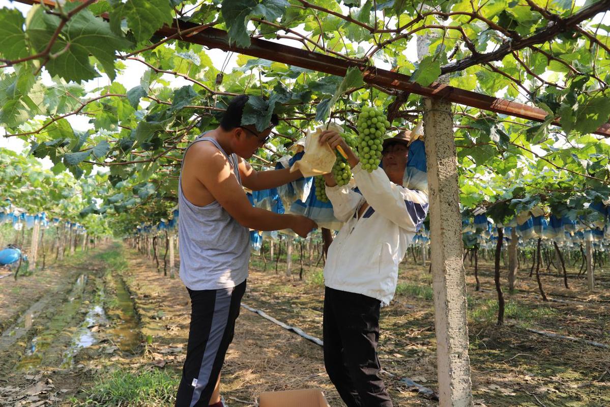 “今年的品质比往年都好,而且果很大、很脆、更甜了,产量预计可以达到六万斤,为我们带来三十多万元的收益。”王红建正忙着采摘、装箱,脸上洋溢着丰收喜悦。他表示,计划明年在葡萄树冠顶部搭建避雨拱棚,进一步提高葡萄产量和品质。