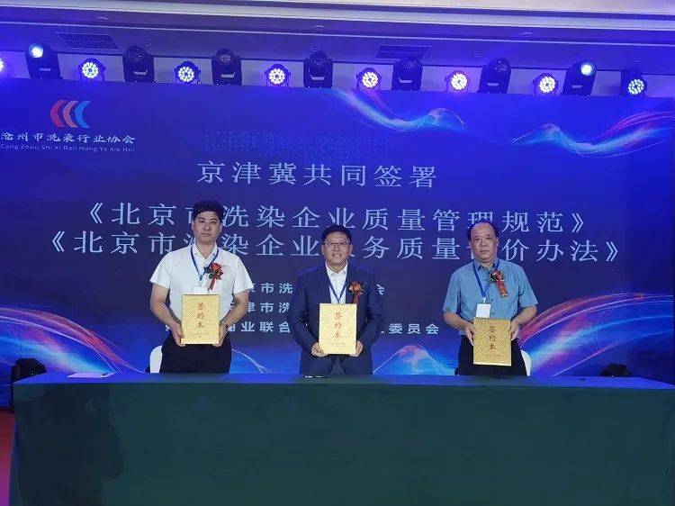 这是继8月28日,在河北沧州举办的第一场北京市洗染行业标准规范宣传贯彻会后的第二场宣贯活动。在沧州会议上,北京市洗染行业协会、天津市洗染行业协会、河北省商联会洗染专业委员会共同签订团体标准共同制订、分别宣贯协议,联合发布《北京市洗染企业质量管理规范》《北京市洗染企业服务质量评价办法》。这意味着京津冀三地洗染业首次通过统一标准的方式团结在一起,共同制订团标,协同发布,共同执行,规范化运作,共同推进京津冀洗染业一体化建设,为京津冀人民提供优质的洗涤服务。北京市商务局生活服务一处处长康凯、干部姚诚、天津市商务局商贸服务处调研员李宗超、河北省商务厅服务贸易处处长王忠林出席会议并见证了这一激动人心的时刻。