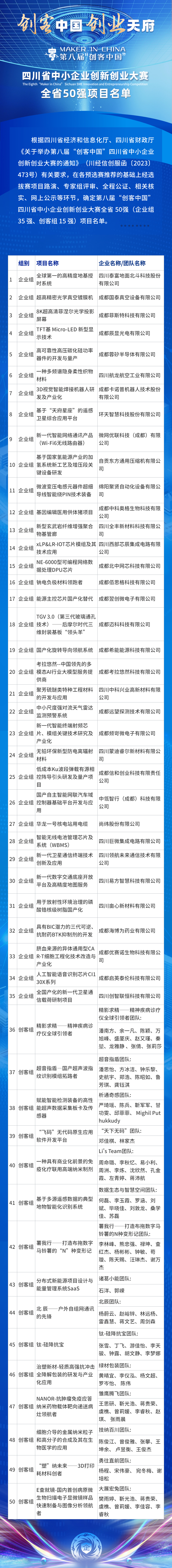 根据四川省经济和信息化厅、四川省财政厅《关于举办第八届“创客中国”四川省中小企业创新创业大赛的通知》(川经信创服函〔2023〕473号)有关要求,在各预选赛推荐的基础上,经选拔赛项目路演、专家组评审、全程公证、相关核实、网上公示等环节,确定第八届“创客中国”四川省中小企业创新创业大赛全省50强(企业组35强、创客组15强)项目名单。