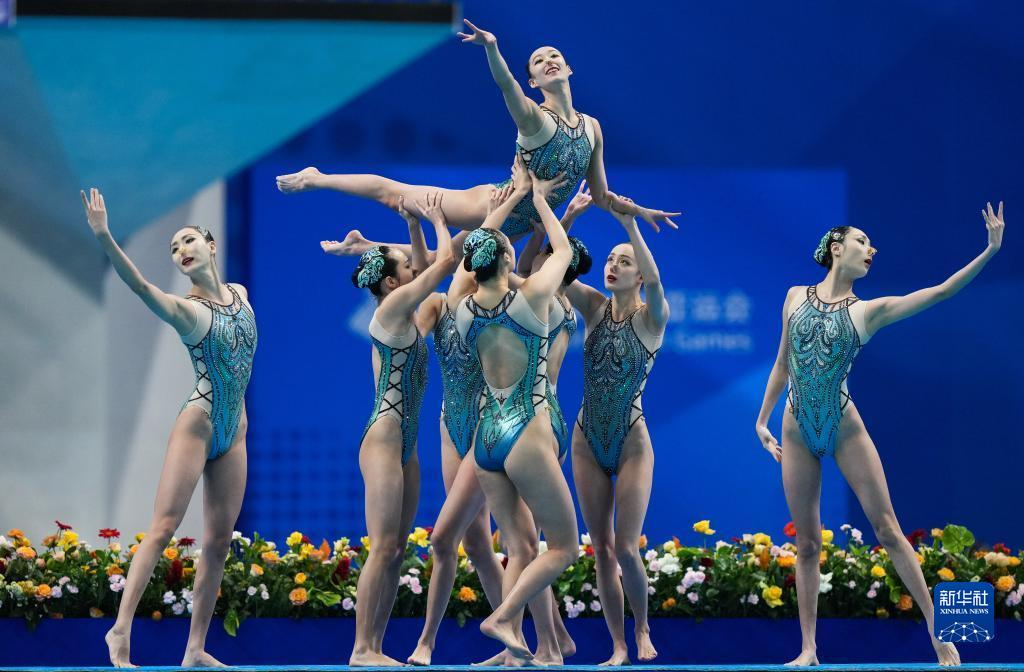亚运会花样游泳集体项目分为技巧自选、技术自选和自由自选三场比赛,中国花游队以《生命之光》的技巧自选动作起始,以难度排名世界第一的《万有引力》自由自选动作燃动水上。以舞姿为画笔,泳池为画布,中国花样游泳融合古典与现代之美,在亚运盛会的尾声将东方神韵以大气、厚重的笔墨描绘下来。