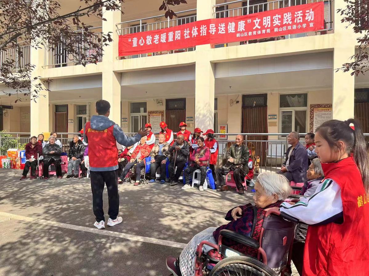 “尊老敬老是中华民族的传统美德,我们将依此为契机,大力发扬社会体育指导全民健身志愿服务精神,继续丰富志愿服务的内涵和延展,为更多需要帮助的老年朋友开展义务服务工作。为全社会的和谐稳定贡献体育力量。”鹤山区双语小学带队老师说。(图片/朱瑞红)