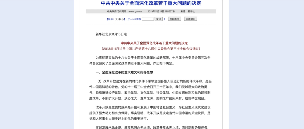 2013年11月,党的十八届三中全会通过由习近平总书记亲自主持起草的《中共中央关于全面深化改革若干重大问题的决定》。《决定》首次提出全面深化改革的总目标——完善和发展中国特色社会主义制度,推进国家治理体系和治理能力现代化。