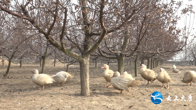 1月7日,记者在清集镇西扶行政村村民秦天风的苹果园里看到,一群鸳鸯鸭正在树下栖息,洁白的羽毛、红色的冠顶在阳光下看起来十分漂亮。