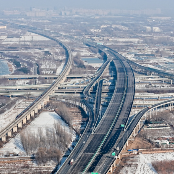 2023年12月28日,车辆行驶在京雄高速北京段上(无人机照片)。当日,京雄高速公路北京五环至六环段顺利贯通。至此,京雄高速全线通车运营。图片来源:新华社