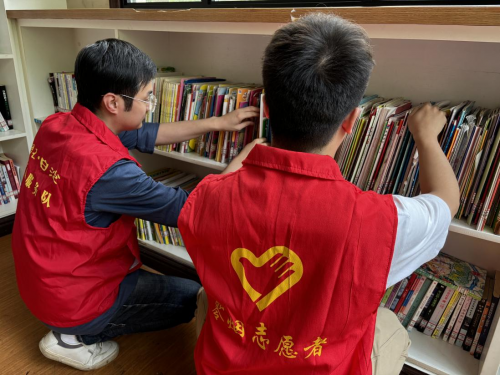 (图为青年志愿者在自助书屋整理书籍 张健摄)