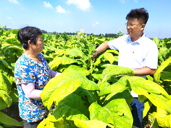 图为烟站技术员(右)正精心进行烟田中后期管理指导