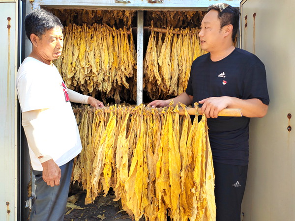 图为烟站负责人(右)正查看烤后烟叶,进行针对性烘烤指导