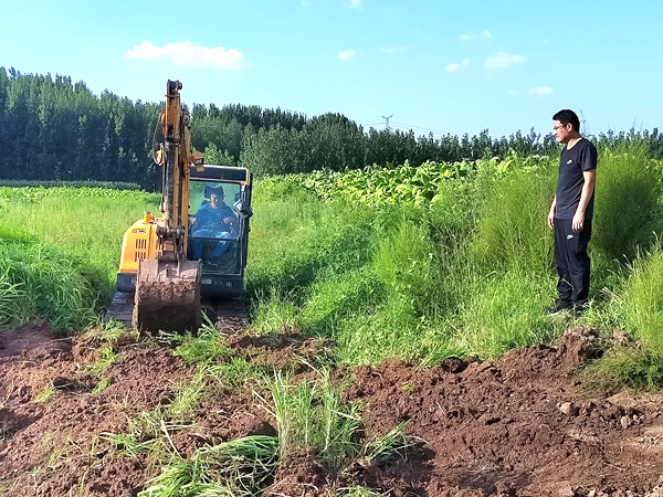 图为帮助烟农协调机械畅通排水沟渠、整修田间道路
