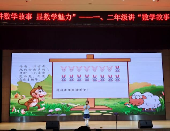 “讲数学故事 显数学魅力”,小选手们站在荧屏前,配合着精心制作的背景,绘声绘色地讲述着《小猪售货员》《偷吃人参果》《小动物做早操》等有趣的故事,他们将深奥的数学变得浅显易懂,将生活中平凡的数学小知识变得妙趣横生,充分展现了数学多方面的延展性。