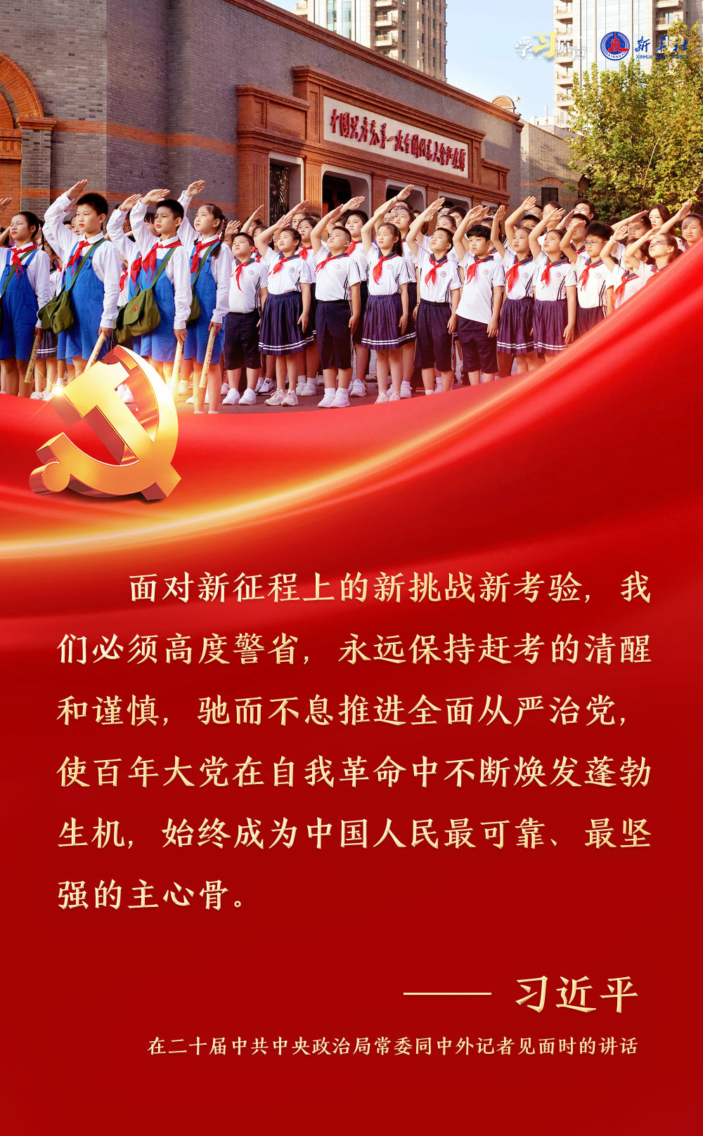 习近平总书记强调,面对新征程上的新挑战新考验,我们必须高度警省,永远保持赶考的清醒和谨慎,驰而不息推进全面从严治党,使百年大党在自我革命中不断焕发蓬勃生机,始终成为中国人民最可靠、最坚强的主心骨。